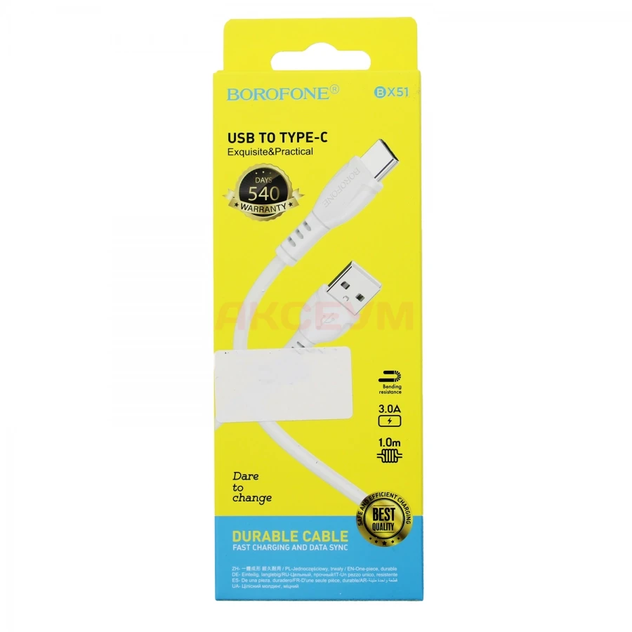 Кабель BX51 от Borofone - это высококачественный кабель длиной 1 м. Он имеет классический USB-разъем для подключения к зарядному устройству или компьютеру. Иногда используется в качестве удлинителя. А также USB Type-C для соединения с вашим устройством. Не поддерживает быструю зарядку, а значит даже если ваше зарядное устройство и смартфон имеют функцию fast charge, именно для быстрой зарядки этот кабель вам не подойдет. Однако вы можете использовать его для передачи данных.